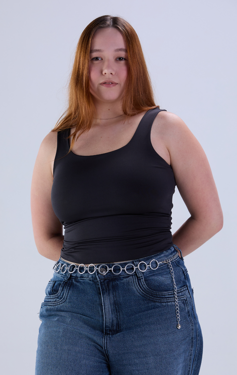 Nossa regata com decote quadrado é aquele item curinga que combina com tudo, do casual ao arrumadinho. Confeccionada em tecido suplex de alta qualidade (90% poliéster + 10% elastano), ela veste com firmeza e conforto, valorizando o corpo sem apertar. O toque é macio, o caimento impecável e a elasticidade perfeita para o dia a dia. Disponível do PP ao GG, nas cores clássicas e versáteis: branca, preta e marrom avelã. Ideal para montar looks estilosos com jeans, saias ou peças em alfaiataria. É aquela peça-chave que vai te acompanhar em todas as ocasiões!