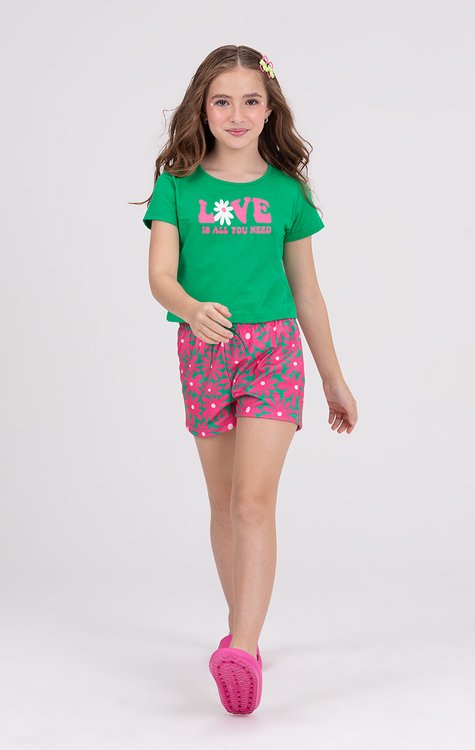 A blusa é desenvolvida na composição 100% algodão e a shorts em 96% poliéster e 4% elastano, matéria prima em meia malha e poliplex sublimado, que proporciona conforto e estilo único. A parte superior destaca-se pela estampa "Love" e a inferior pelo shorts e o detalhe do cadarço decorativo, adicionando um toque delicado e estiloso ao visual. Moderno, é perfeito para diversas ocasiões, proporcionando versatilidade para as pequenas deixando-as prontas para qualquer ocasião.