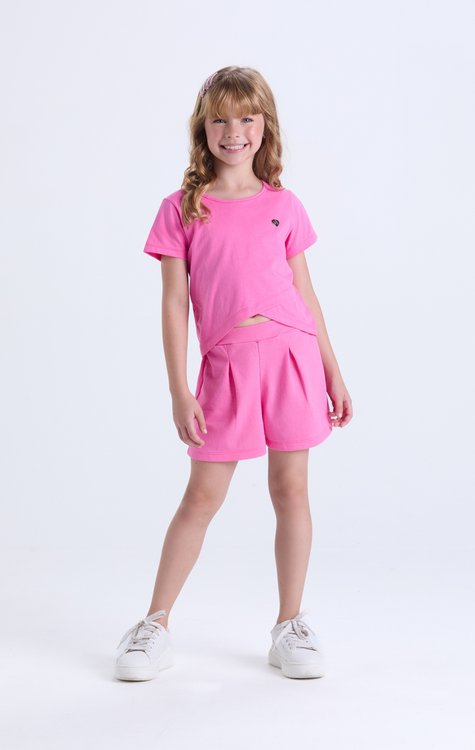 Estilo e conforto para os dias mais quentes! Esse conjunto feminino infantil é a escolha perfeita para o verão. A camiseta em meia malha 100% algodão é leve e fresquinha, com recorte transpassado em X na barra, trazendo toque moderno ao look. O delicado pingente de coração na parte superior dá charme extra. O shorts em moletom leve, com pences frontais e elástico na cintura, oferece caimento perfeito, liberdade de movimento e conforto. Disponível do 2 ao 14, ideal para acompanhar as meninas com estilo. Composição: Camiseta 100% algodão. Shorts 60% algodão, 40% poliéster.