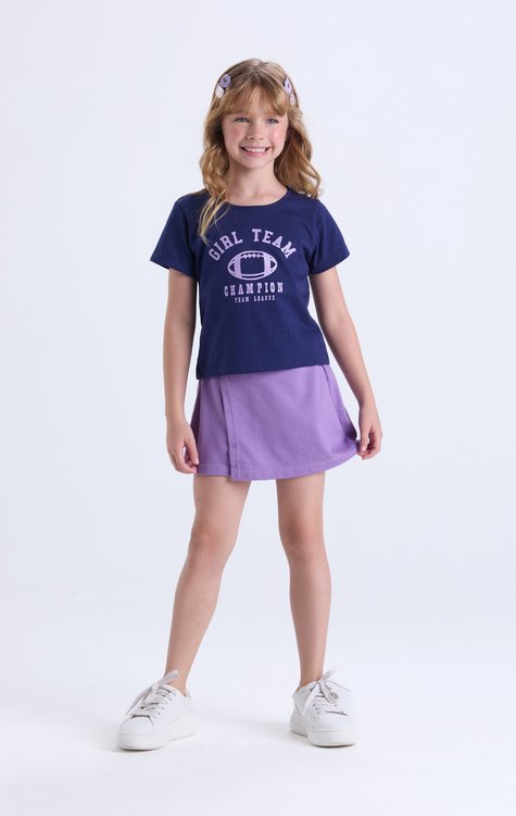 Estilo e atitude para os dias quentes! Esse conjunto feminino é composto por camiseta em meia malha, macia e respirável, com estampa de bola de futebol americano e a frase “GIRL TEAM - CHAMPION TEAM LEAGUE”, perfeita para meninas cheias de personalidade. O shorts-saia em moletom leve tem elástico na cintura, proporcionando caimento confortável e liberdade de movimento. Ideal para passeios, brincadeiras e curtir o verão com muito estilo! Tamanhos: do 2 ao 14. Composição: Camiseta: 100% algodão. Shorts: 60% algodão, 40% poliéster.