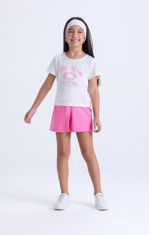 Estilo e atitude para os dias quentes! Esse conjunto feminino é composto por camiseta em meia malha, macia e respirável, com estampa de bola de futebol americano e a frase “GIRL TEAM - CHAMPION TEAM LEAGUE”, perfeita para meninas cheias de personalidade. O shorts-saia em moletom leve tem elástico na cintura, proporcionando caimento confortável e liberdade de movimento. Ideal para passeios, brincadeiras e curtir o verão com muito estilo! Tamanhos: do 2 ao 14. Composição: Camiseta: 100% algodão. Shorts: 60% algodão, 40% poliéster.