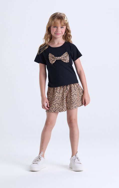 Estilo, conforto e um toque de charme para os dias mais quentes! Esse conjunto infantil feminino é perfeito para o verão, com uma camiseta cropped feita em meia malha 100% algodão, super fresquinha e com um laço de oncinha delicado no peito que traz aquele detalhe fashion irresistível. O shorts em poliplex, com estampa animal print, tem elástico na cintura e cordão ajustável, garantindo liberdade nos movimentos com muito estilo. Do tamanho 2 ao 14, é a escolha certa para meninas que querem curtir o verão com leveza, conforto e personalidade!
