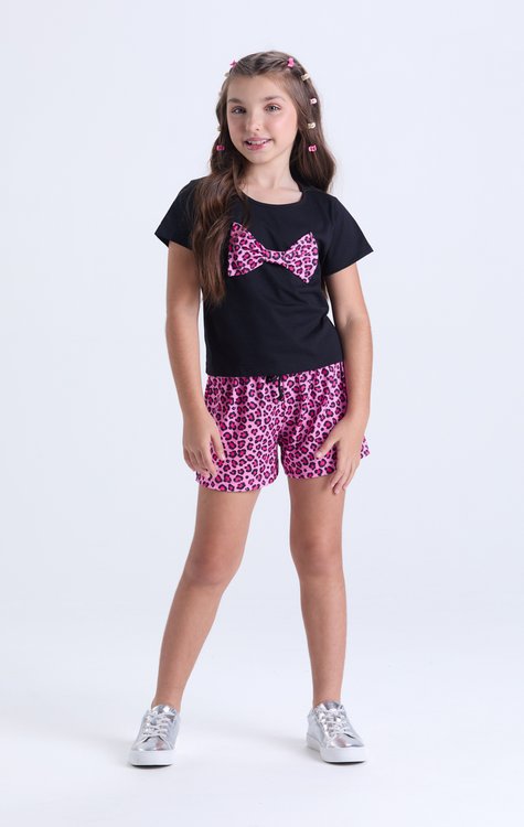 Estilo, conforto e um toque de charme para os dias mais quentes! Esse conjunto infantil feminino é perfeito para o verão, com uma camiseta cropped feita em meia malha 100% algodão, super fresquinha e com um laço de oncinha delicado no peito que traz aquele detalhe fashion irresistível. O shorts em poliplex, com estampa animal print, tem elástico na cintura e cordão ajustável, garantindo liberdade nos movimentos com muito estilo. Do tamanho 2 ao 14, é a escolha certa para meninas que querem curtir o verão com leveza, conforto e personalidade!