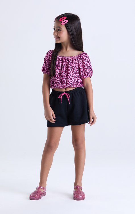 Deixe o verão ainda mais estiloso com esse conjunto infantil feminino cheio de atitude! O cropped em poliplex garante conforto e um toque fashion com estampa de oncinha, babadinho e mangas bufantes que são puro charme. Já o shorts em moletom sem felpa é leve, fresquinho e possui elástico na cintura com cordão contrastante, oferecendo ajuste ideal e estilo extra. Um look pensado para meninas cheias de personalidade que adoram se sentir bem para brincar e arrasar em qualquer ocasião! Tamanhos: do 2 ao 14. Composição: Blusa: 96% poliéster e 4% elastano. Shorts: 100% algodão !