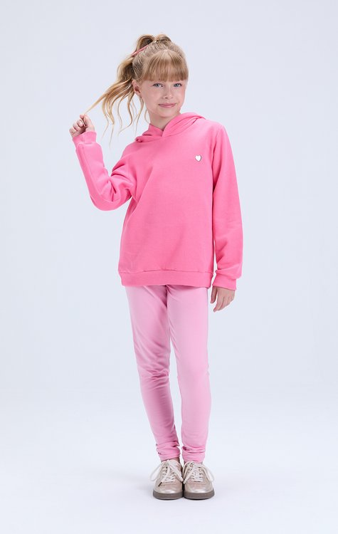 Esse conjunto infantil feminino de inverno é perfeito para quem busca conforto com um visual moderno. A blusa lisa em moletom 100% algodão oferece maciez, capuz prático e um detalhe especial com pingente de coração decorativo, que valoriza o visual de forma delicada. A calça legging lisa em suplex térmico (92% poliéster e 8% elastano) proporciona liberdade de movimentos, aquecimento e excelente caimento, com elástico na cintura para mais conforto. Um conjunto versátil, ideal para o dia a dia, do tamanho 2 ao 14.