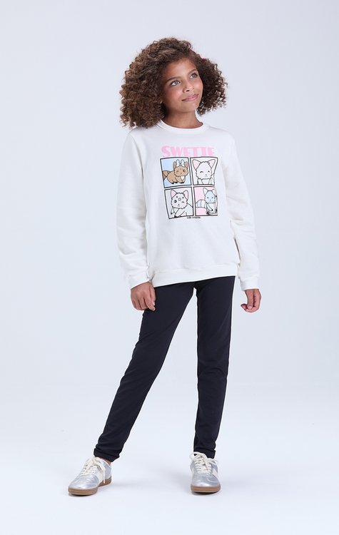 O conjunto infantil feminino de inverno perfeito para unir conforto, estilo e fofura nos dias frios. A blusa em moletom 100% algodão garante maciez e aquecimento, trazendo no centro uma estampa encantadora de gatinhos com a palavra “Swetie”, que deixa a peça ainda mais delicada. A calça em suplex térmico (92% poliéster e 8% elastano) é lisa, confortável e possui elástico na cintura, proporcionando liberdade de movimentos. Disponível do tamanho 2 ao 14, é ideal para o dia a dia com muito charme.