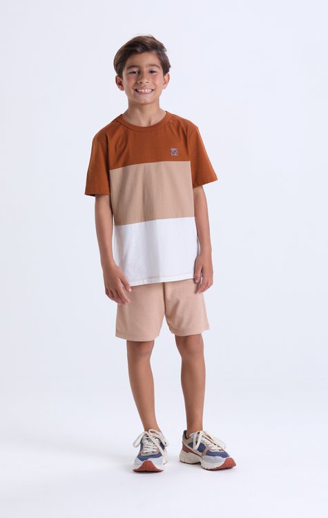Estilo e conforto para os dias de sol! Esse conjunto de verão masculino infantil traz camiseta 100% algodão leve e moderna, com design em três faixas horizontais em tons contrastantes, criando um visual marcante e cheio de personalidade. Um pequeno aplique na parte superior completa o look com charme discreto. A bermuda de moletom web (60% algodão, 40% poliéster) tem caimento leve, toque macio e elástico na cintura para ajuste perfeito. Do tamanho 2 ao 14, é ideal para o verão dos meninos, unindo estilo e liberdade para brincar.
