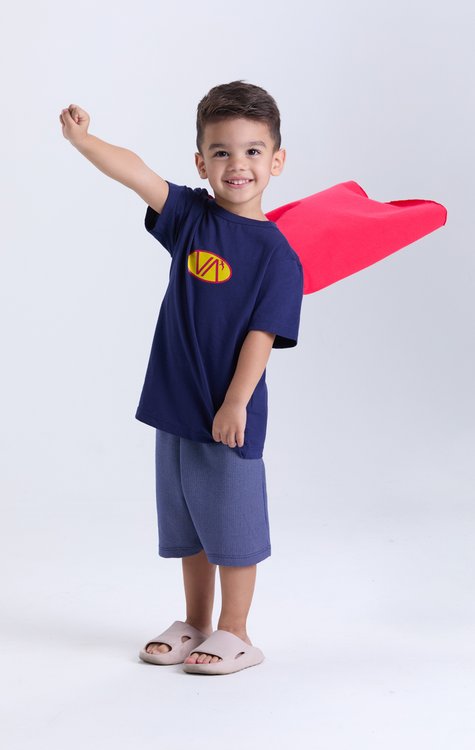 Diversão, conforto e imaginação para o verão dos meninos! Este conjunto infantil masculino transforma os dias quentes em aventuras inesquecíveis. A camiseta em meia malha 100% algodão acompanha uma capa removível, perfeita para soltar a criatividade e brincar como um verdadeiro herói. Com estampa central discreta “VA” em formato oval, traz estilo na medida certa. A bermuda em moletom web (60% algodão, 40% poliéster) tem elástico na cintura, garantindo conforto e liberdade. Do tamanho 2 ao 8, une moda, brincadeira e praticidade para o verão!