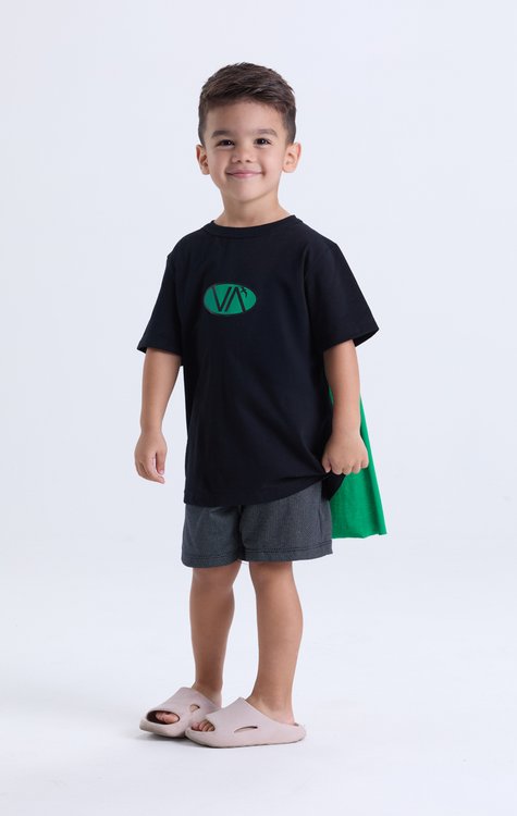 Diversão, conforto e imaginação para o verão dos meninos! Este conjunto infantil masculino transforma os dias quentes em aventuras inesquecíveis. A camiseta em meia malha 100% algodão acompanha uma capa removível, perfeita para soltar a criatividade e brincar como um verdadeiro herói. Com estampa central discreta “VA” em formato oval, traz estilo na medida certa. A bermuda em moletom web (60% algodão, 40% poliéster) tem elástico na cintura, garantindo conforto e liberdade. Do tamanho 2 ao 8, une moda, brincadeira e praticidade para o verão!