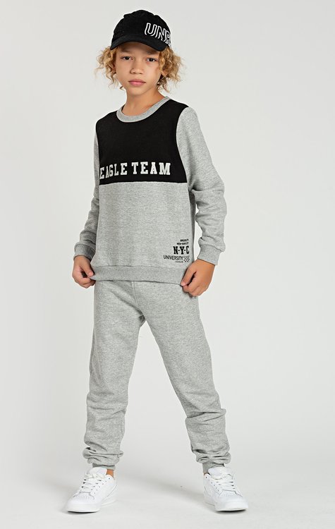 O Conjunto Infantil Mescla de Moletom "Eagle Team" é uma opção estilosa para os pequenos. Com tonalidade mescla, confeccionado em moletom para um toque aconchegante. A parte superior destaca-se pela estampa "Eagle Team", adicionando um toque esportivo ao visual. Moderno e versátil, é perfeito para diversas ocasiões, proporcionando conforto e estilo. Transforme o visual dos pequenos com este conjunto cheio de energia.