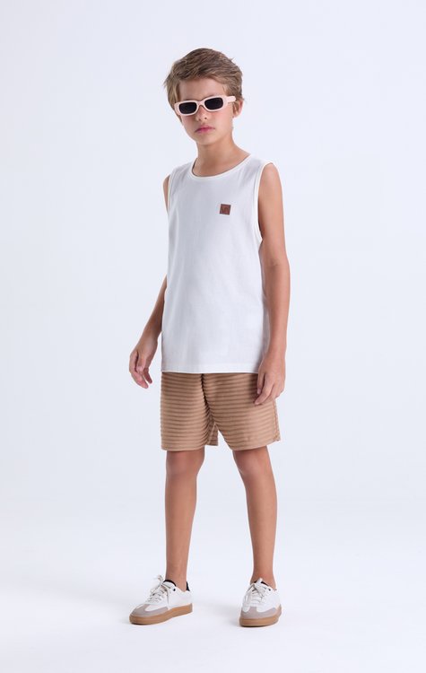 Conforto e estilo para o verão dos meninos! Esse conjunto infantil é composto por regata em meia malha 100% algodão, leve, macia e com aplique discreto na lateral superior, garantindo um toque de personalidade. A bermuda em moletom com listras em relevo traz visual moderno e diferenciado, com elástico na cintura para ajuste ideal e liberdade nos movimentos. Um look fresquinho e cheio de atitude para os dias mais quentes! Tamanhos: do 2 ao 14.