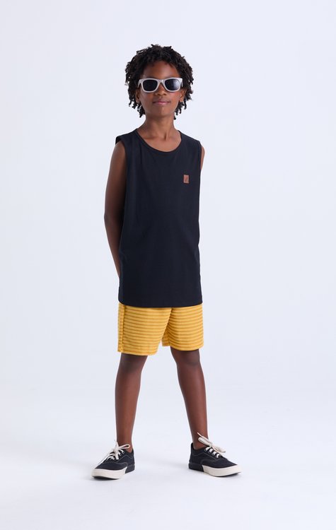Conforto e estilo para o verão dos meninos! Esse conjunto infantil é composto por regata em meia malha 100% algodão, leve, macia e com aplique discreto na lateral superior, garantindo um toque de personalidade. A bermuda em moletom com listras em relevo traz visual moderno e diferenciado, com elástico na cintura para ajuste ideal e liberdade nos movimentos. Um look fresquinho e cheio de atitude para os dias mais quentes! Tamanhos: do 2 ao 14.