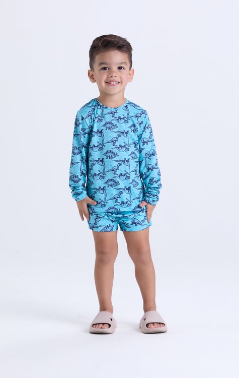 Prepare os pequenos para aventuras no verão com este Conjunto Moda Praia Masculino com Proteção UV 50+, perfeito para curtir o sol com estilo e segurança! A camiseta em suplex evidence traz uma divertida estampa de dinossauros, enquanto a sunga em suplex infinity sublimado, forrada com crepe, oferece mais conforto e liberdade de movimento. Super elástico e ajustável ao corpo, é ideal para brincar na praia, piscina ou ao ar livre. Tamanhos do 2 ao 14. Composição: camiseta 91% poliéster, 9% elastano. Sunga 91% poliéster, 9% elastano. Forro 92% poliéster, 8% elastano.