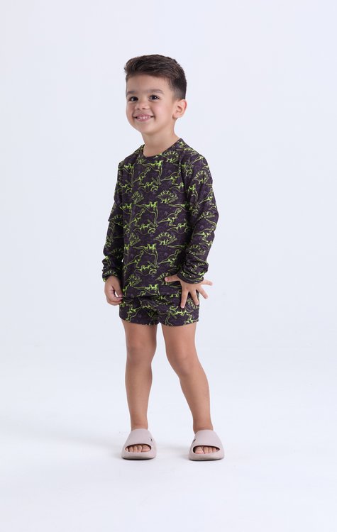 Prepare os pequenos para aventuras no verão com este Conjunto Moda Praia Masculino com Proteção UV 50+, perfeito para curtir o sol com estilo e segurança! A camiseta em suplex evidence traz uma divertida estampa de dinossauros, enquanto a sunga em suplex infinity sublimado, forrada com crepe, oferece mais conforto e liberdade de movimento. Super elástico e ajustável ao corpo, é ideal para brincar na praia, piscina ou ao ar livre. Tamanhos do 2 ao 14. Composição: camiseta 91% poliéster, 9% elastano. Sunga 91% poliéster, 9% elastano. Forro 92% poliéster, 8% elastano.