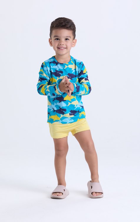 Prepare-se para um verão cheio de aventuras com esse conjunto moda praia masculino com proteção UV 50+! A camiseta em suplex evidence traz estampa divertida de tubarões por toda a peça, garantindo um visual animado e cheio de personalidade. A sunga lisa em suplex infinity, com forro em crepe, equilibra o look e oferece conforto total para brincar e nadar à vontade. Super elástico, leve e macio, o conjunto veste muito bem e garante liberdade nos movimentos. Ideal para meninos dos tamanhos 2 ao 14. Composição: Camiseta: 91% Poliéster, 9% Elastano. Sunga: 90% Poliéster, 10% Elastano. Forro: 92% Poliéster, 8% Elastano.
