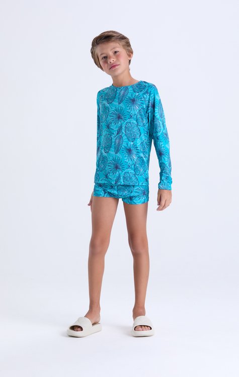 Entre no clima do verão com este Conjunto Moda Praia Masculino Infantil com Proteção UV 50+, perfeito para garantir estilo, conforto e segurança nas brincadeiras ao sol! A camiseta em suplex evidence traz estampa tropical de folhagens, leveza e ajuste ao corpo. A sunga em suplex infinity sublimado conta com forro interno em crepe, proporcionando conforto e segurança durante o uso. O tecido elástico garante liberdade de movimentos para brincar e se divertir o dia todo. Disponível nos tamanhos 2 ao 14, é a escolha ideal para praia, piscina e dias quentes.