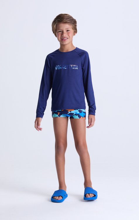 Estilo radical para os pequenos aventureiros! Esse conjunto moda praia masculino com proteção UV 50+ une conforto, elasticidade e personalidade para os dias de sol. Acompanha camiseta em suplex leve, com elasticidade ideal que se ajusta ao corpo, design liso e estampa estilizada no centro. A sunga, também em suplex, possui forro interno em crepe, garantindo conforto e segurança. Ideal para férias, brincadeiras e mergulhos. Tamanhos: do 2 ao 14. Composição: Camiseta 90% poliéster 10% elastano / Sunga 91% poliéster 9% elastano / Forro 92% poliéster 8% elastano.