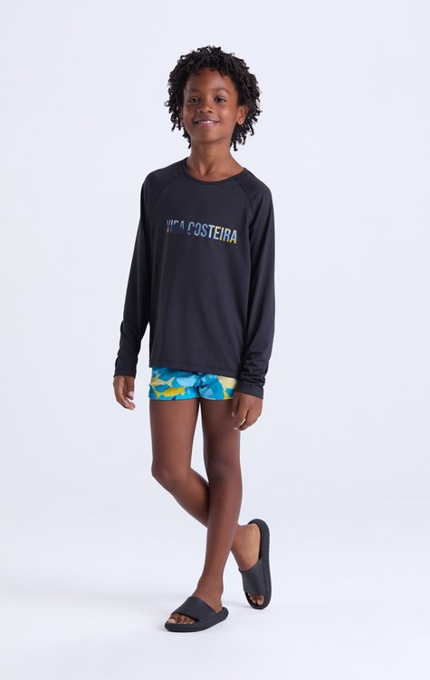 Estilo radical para os pequenos aventureiros! Esse conjunto moda praia masculino com proteção UV 50+ une conforto, elasticidade e personalidade para os dias de sol. Acompanha camiseta em suplex leve, com elasticidade ideal que se ajusta ao corpo, design liso e estampa estilizada no centro. A sunga, também em suplex, possui forro interno em crepe, garantindo conforto e segurança. Ideal para férias, brincadeiras e mergulhos. Tamanhos: do 2 ao 14. Composição: Camiseta 90% poliéster 10% elastano / Sunga 91% poliéster 9% elastano / Forro 92% poliéster 8% elastano.