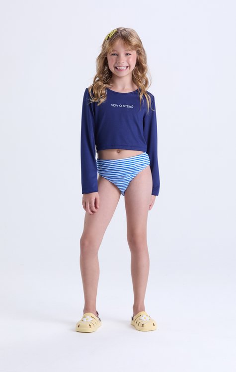 Prepare-se para dias ensolarados com muito estilo e proteção! Nosso conjunto infantil de moda praia foi feito especialmente para as pequenas curtirem o verão com conforto e segurança. Com blusa manga longa lisa e calcinha estampada, ambas em suplex com proteção UV50+, garante charme e cuidado com a pele. O tecido tem toque leve, é respirável e possui ótimo caimento — ideal para brincar à vontade sob o sol. Detalhe delicado da marca no centro do busto. Tamanhos: do 2 ao 14. Composição: Blusa: 90% Poliéster e 10% Elastano. Calcinha: 91% Poliéster e 9% Elastano. Forro: 92% Poliéster e 8% Elastano.