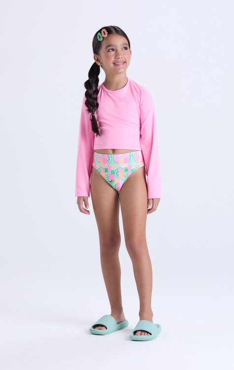 Prepare-se para dias ensolarados com muito estilo e proteção! Nosso conjunto infantil de moda praia foi feito especialmente para as pequenas curtirem o verão com conforto e segurança. Com blusa manga longa lisa e calcinha estampada, ambas em suplex com proteção UV50+, garante charme e cuidado com a pele. O tecido tem toque leve, é respirável e possui ótimo caimento — ideal para brincar à vontade sob o sol. Detalhe delicado da marca no centro do busto. Tamanhos: do 2 ao 14. Composição: Blusa: 90% Poliéster e 10% Elastano. Calcinha: 91% Poliéster e 9% Elastano. Forro: 92% Poliéster e 8% Elastano.