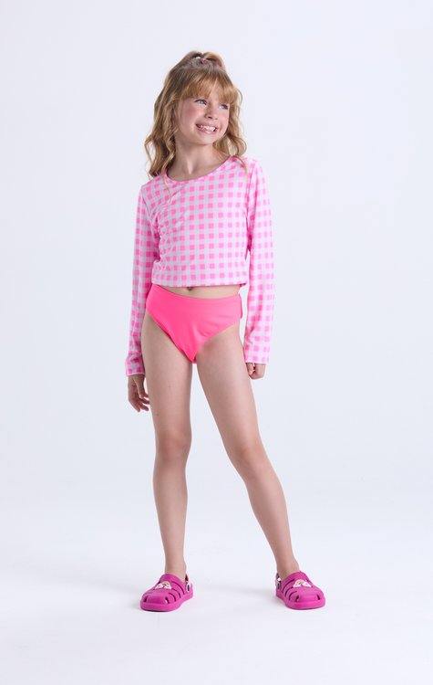 Proteção, estilo e fofura em um só look! Nosso conjunto infantil feminino para praia é ideal para as pequenas curtirem o verão com segurança e conforto. Feito em suplex com proteção UV50+, conta com blusinha de manga longa que protege do sol e calcinha com forro interno para mais conforto nas brincadeiras. O tecido é leve, respirável, tem toque macio e ótimo caimento. Perfeito para os dias ensolarados! Composição: Blusa: 91% Poliéster e 9% Elastano. Calcinha: 90% Poliéster e 10% Elastano. Forro: 92% Poliéster e 8% Elastano. Tamanhos: do 2 ao 14.