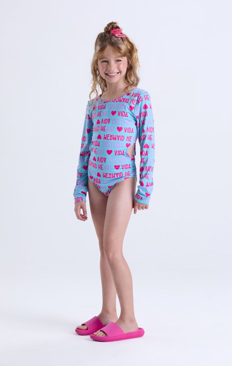 Para as pequenas curtirem o verão com muito estilo e segurança! Nosso maiô em suplex com proteção UV 50+ une conforto, charme e proteção solar. Com recortes laterais, babadinhos na barra e manga longa, o modelo traz um visual lúdico e fashion — perfeito para brincar com liberdade mesmo nos dias mais quentes. O tecido respirável se ajusta ao corpo, garantindo mobilidade e bem-estar. Possui forro interno em crepe para mais conforto. Ideal para meninas dos tamanhos 2 ao 14. Composição: Corpo: 91% Poliéster e 9% Elastano. Forro: 92% Poliéster e 8% Elastano.