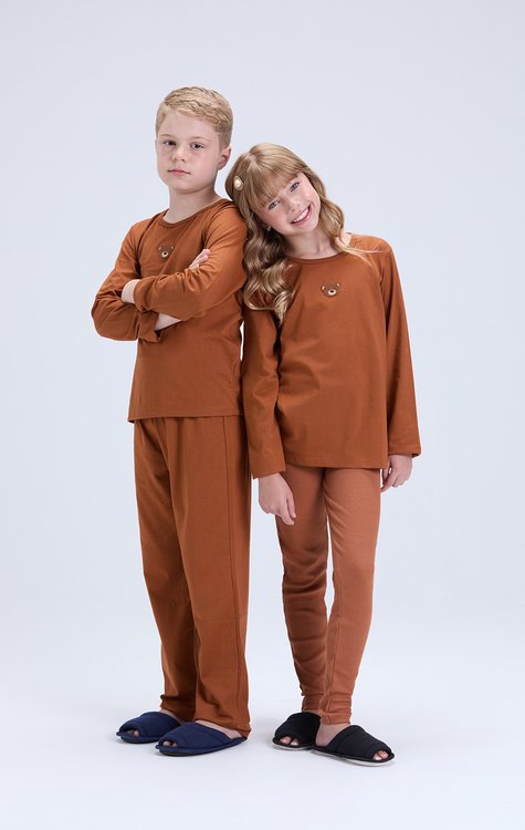 Charmoso e aconchegante, esse conjunto de pijama infantil feminino é perfeito para o inverno. A camiseta em meia malha 100% algodão na cor caramelo tem toque suave e aplique central de ursinho, trazendo um visual delicado e atual. A calça legging em ribana canelada caramelo (97% algodão e 3% poliéster) proporciona conforto térmico e ajuste perfeito ao corpo, com elástico na cintura. Um pijama quentinho, bonito e funcional, disponível do tamanho 2 ao 14.